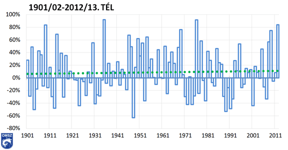 Az országos téli csapadékösszegek százalékos eltérése a sokéves (1971-2000-es)átlagtól 1901 és 2011 között (interpolált adatok alapján)