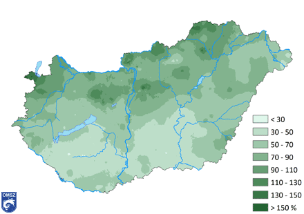 Az idei nyáron a csapadék eloszlása igen szélsőséges képet mutatott: míg északon többfelé a normált meghaladó mennyiség hullott, a déli területek súlyos csapadékhiánnyal küzdöttek. A 2012-es nyáron a megszokott csapadékmennyiség mindössze 68%-a hullott le országos átlagban. Hazánk délebbre eső területei kapták a legkevesebb esőt (7. ábra), a normál 30-50%-át regisztráltuk a három hónapot együtt vizsgálva. A legtöbb csapadékot Sopron környéke kapta, a normál több mint 150%-a hullott le, ezt követi Borsod-Abaúj-Zemplén megye ÉNy-i része, 130-150%-kal.