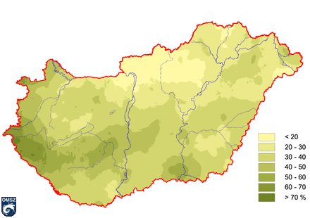 A 7. ábra térképe alapján látható, hogy országszerte kevesebb csapadék hullott a szokásosnál. Nógrád megye térségében az értékek a sokéves átlag 20%-át sem érték el, az Alföldön tapasztalt csapadékmennyiség pedig általában a szokásos összeg fele sem volt. Még a csapadékosabb délnyugati területek hozamai is alacsonyabbak volt, mint az átlag 70%-a.