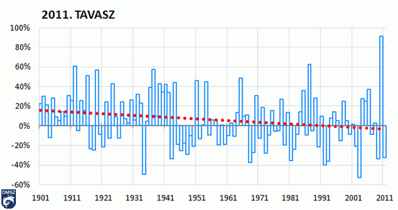 A tavaszi csapadékösszegek 1901 óta lassan csökkenő tendenciát mutatnak (9. ábra). Az elmúlt időszak az átlag alatti csapadékú évek sorát gyarapította, ennek megfelelően a 111 év sorrendjének a szárazabb végére került. A 2011-es a 9. legszárazabb (a 103. legcsapadékosabb) tavasz volt. (II. táblázat).