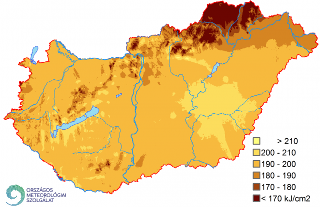 A nyári globálsugárzás összeg (11. ábra) a csapadékos időjárás miatt jellemzően 180 és 210 kJ/cm2 közé esett az ország legnagyobb részén. Alacsonyabb értékek (170 kJ/cm2 alatt) az északkeleti országrészre és a középhegységi tájainkra voltak jellemzőek. A globálsugárzás legmagasabb évszakos értékeit az Alföld középső és keleti tájain (Közép-Tisza vidék, Berettyó-Körös vidék, Körös-Maros köze) összegeztük, ahol 210 kJ/cm2-nél magasabb értékek adódtak.