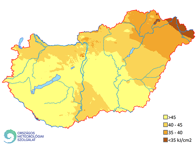 A legalacsonyabb évszakos globálsugárzás értékeket egyértelműen az északkeleti országrészben figyelhetjük meg (11. ábra): a Felső-Tisza vidéken 35 kJ/cm2 alatti érték is előfordult. A legtöbb globálsugárzás a Dunántúlon és az Alföld középső-déli részén érkezett (több mint 45 kJ/cm2), de a januári hideglégpárnás helyzet miatt a magasabb hegységeink is nagyobb sugárzásbevételhez jutottak.