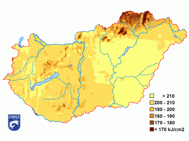 A nyári globálsugárzás összeg (11. ábra) jellemzően 190 és 210 kJ/cm2 közé esett az ország legnagyobb részén. Alacsonyabb értékek (170 kJ/cm2 alatt) a borúsabb északkeleti országrészre és a középhegységi tájainkra voltak jellemzőek. A globálsugárzás legmagasabb évszakos értékeit az Alföld középső és keleti tájain (Közép-Tisza vidék, Berettyó-Körös vidék, Körös-Maros köze) összegeztük, ahol 210 kJ/cm2-nél magasabb értékek adódtak.