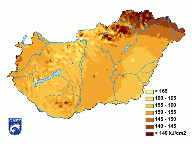 A globálsugárzás értékei 140 és 165 kJ/cm2 között alakultak (11. ábra). Az ország legnagyobb részén 150-160 kJ/cm2 volt jellemző. Ennél alacsonyabb értékek csak az ország északkeleti részén, magasabb értékek foltokban jelentkeztek, leginkább az Észak-Dunántúl területein és a Balaton környékén.