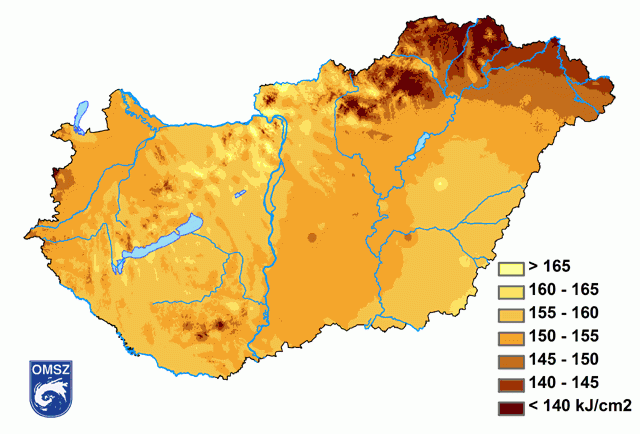 A globálsugárzás értékei 140 és 165 kJ/cm2 között alakultak (11. ábra). Az ország legnagyobb részén 150-160 kJ/cm2 volt jellemző. Ennél alacsonyabb értékek csak az ország északkeleti részén, magasabb értékek pedig a Dunazug-hegység területein jelentkeztek.