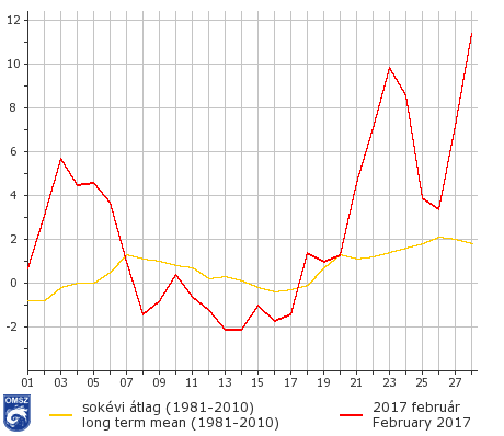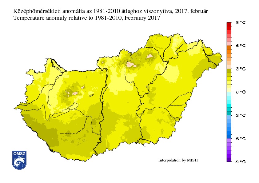 Az igen zord időjárású január után február elején egy nyugat-európai ciklonrendszer előoldalán délies áramlással kifejezetten enyhe levegő áramlott hazánk fölé, mely az átlagosnál melegebb időjárást eredményezett. A hónap közepén újra visszaesett a hőmérséklet, mert a Földközi–tenger felett örvénylő ciklon áramlási rendszerében északnyugat felől újra hideg légtömegek érkeztek térségünkbe. Egy anticiklon fokozatos megerősödése újra hideg, télies időjárást hozott. Ezekben a napokban a sokévi átlag alatt alakult a hőmérséklet, és megnövekedett a szennyezőanyag koncentráció. A Kárpát-medencétől északra kialakuló többközpontú ciklonrendszer hatására erőteljes felmelegedés vette kezdetét, és a hónap végén igazi tavaszias időjárással búcsúzott a tél. Február 28-án megdőlt a még 1927-ben felállított országos melegrekord, a Csongrád megyei Kiszomboron 21,6°C-ot mértünk.