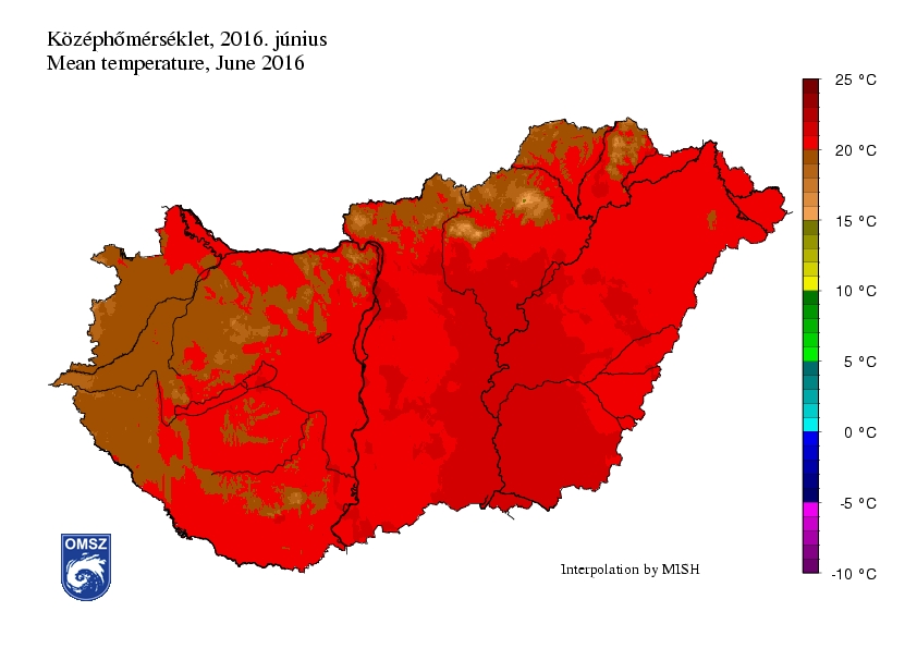 A nyár első hónapjában a havi középhőmérséklet az egész országban a 30 éves normál felett alakult, a Balaton keleti medencéjében, Az Öreg-Bakonyban, Budapest környékén és az Északi-középhegység területén közel 2°C –kal is melegebb volt, mint ahogy egyébként ilyenkor szokásos.