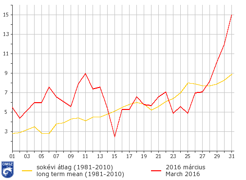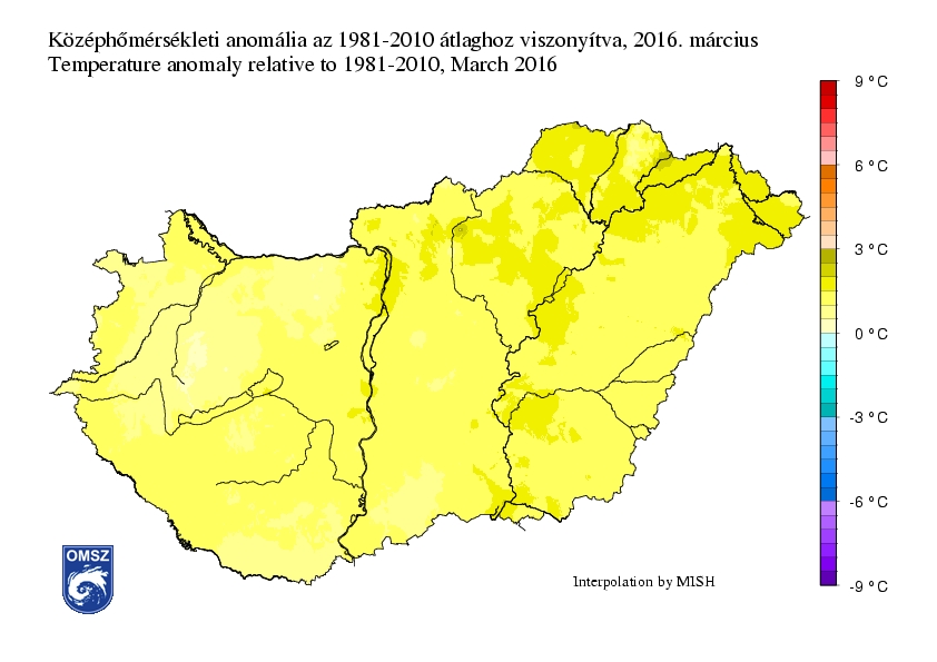 Március első fele a szokásosnál melegebb volt. Március 15-én hazánk időjárását egy magassági hidegcsepp határozta meg, amely mögött hideg levegő áramlott be, továbbá ezen a napon regisztráltuk országosan a legalacsonyabb átlaghőmérsékleti értéket (2,2 °C) is. A március 23-27 közötti időszakban egymást érték a hidegfrontok, melyek a szokásosnál hűvösebb időt eredményeztek. A hónapot egy erőteljes melegedési folyamat zárta, és országos átlagban 31-én mértük a legmagasabb hőmérsékleti értéket (15 °C).