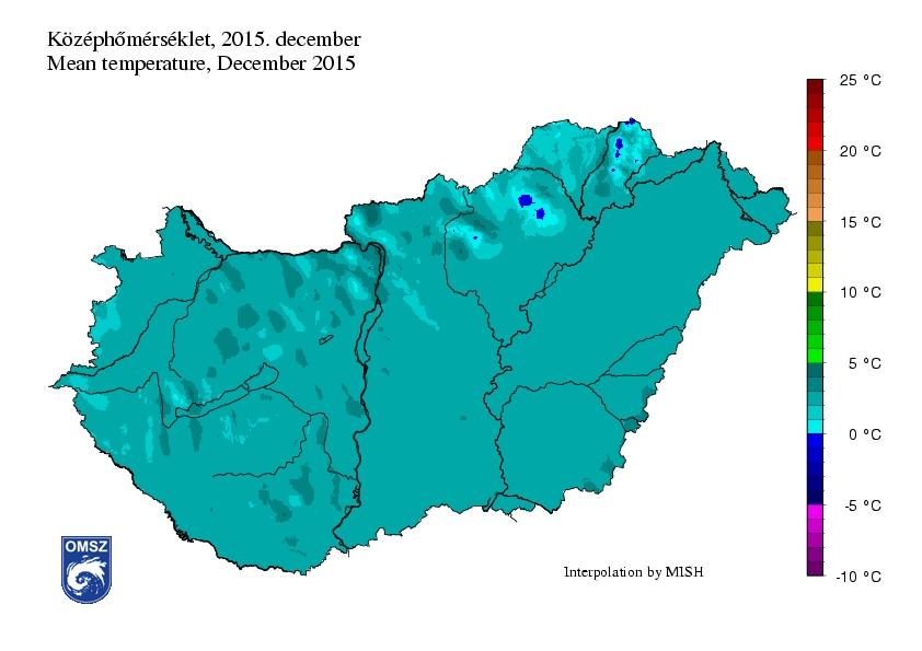Decemberben az ország túlnyomó részén 2-3°C-os középhőmérsékletet mértünk. Egyes területeken az átlaghőmérséklet megközelítette az 4°C-ot. Hűvösebb körzetek az Északi-középhegység legmagasabb pontjain voltak, főként a Bükkben és a Zempléni-hegységben. A térképen is jól látható, hogy ezeken a területeken a havi középhőmérséklet 0°C alatt alakult.