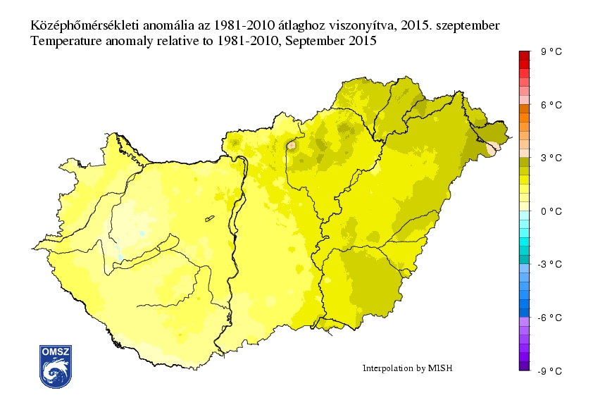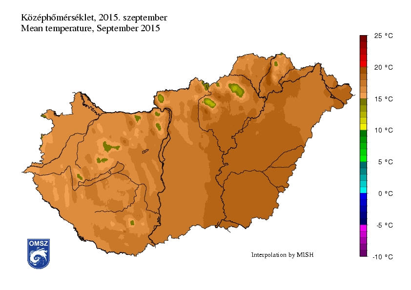 Szeptemberben az ország túlnyomó részén 16-18°C-os középhőmérsékletet mértünk. A Tiszta mentén és az Alföld délkeleti részén, igen nagy területen jelentkeztek 19-20°C közötti értékek. Hűvösebb területek a magasabb hegységeinkben voltak (13-16°C), az Északi-középhegység legmagasabb pontjain 12°C alatti értékeket is láthatunk a térképen.