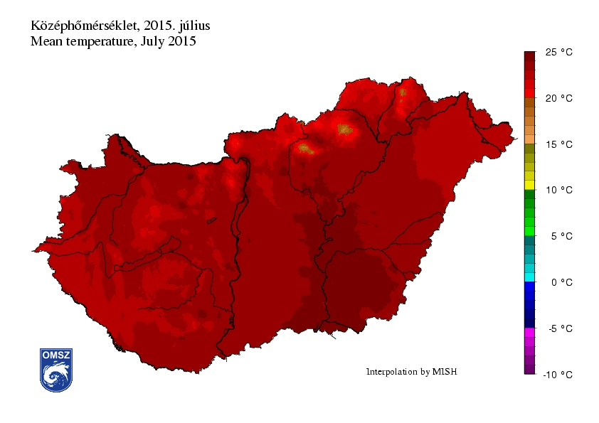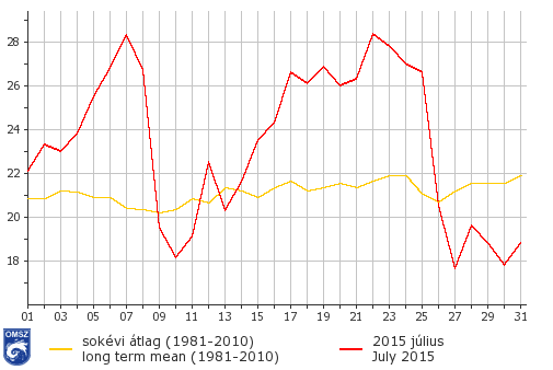 Mindössze július 9. és 11., illetve a hónap végén 27-étől látható a normálnál alacsonyabb napi középhőmérsékleti érték, ezeket leszámítva a hónap során minden nap jóval melegebb volt a megszokottnál országos átlagban. A legnagyobb anomália +7,2 °C. Az Országos Meteorológiai Szolgálat előrejelzései alapján az ÁNTSZ a következő napokra vonatkozóan adott ki harmadfokú hőségriasztást (napi középhőmérséklet legalább három egymást követő napon eléri, vagy meghaladja a 27°C-ot) hőhullám miatt: 2015. július 4., 5., 6., 7., 8, 17., 18., 19., 20., 21., 22., 23., 24., 25., 26.