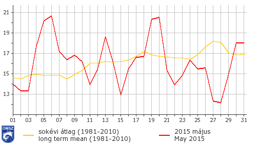 A napi országos átlaghőmérsékletekre nagyfokú ingadozás volt jellemző, melynek során négy maximumot és öt minimumot jegyeztünk. A legmagasabb érték május 6-án jelentkezett, ekkor országos átlagban 20 °C-nál is melegebb volt. A leghűvösebb nap május 28-a volt, ekkor 12 °C volt az országos érték.