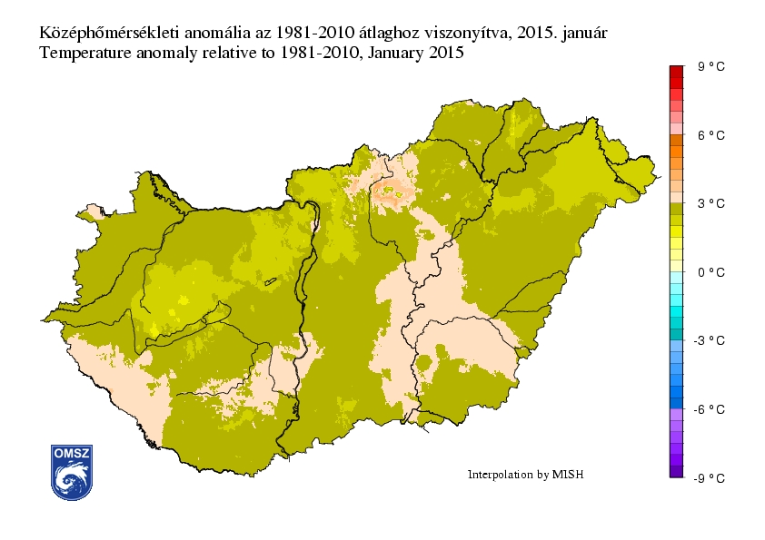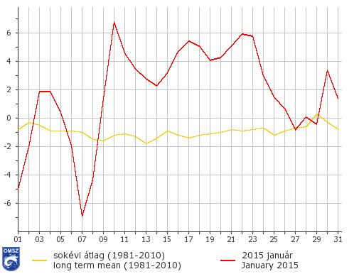 2015 januárja az ország legnagyobb részén 2-3 °C-kal melegebbnek bizonyult a megszokottnál. Pásztó környékén még a 3,5 °C-ot is meghaladta az anomália. A sokéves átlagnál hűvösebb január sehol sem fordult elő.