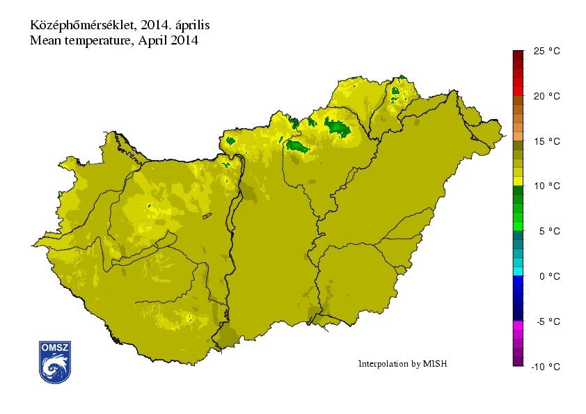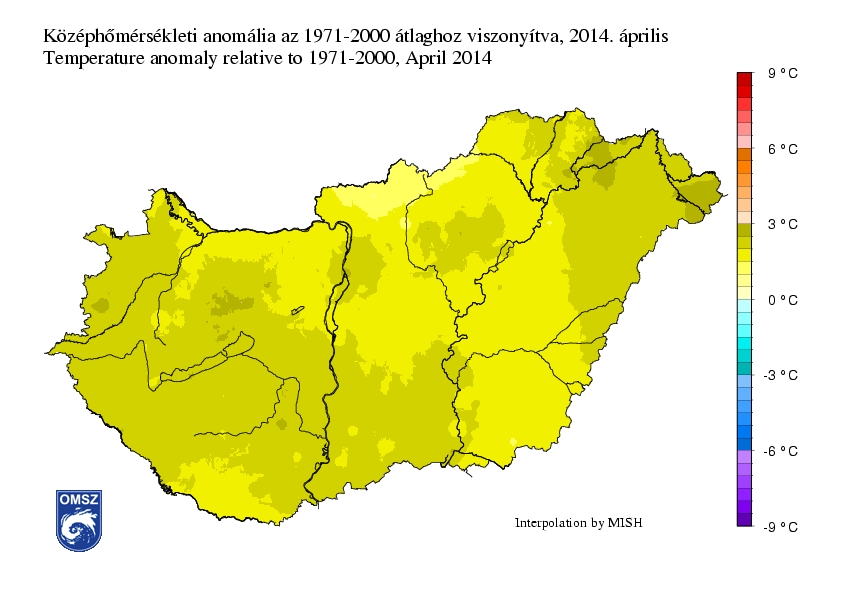 2014 áprilisa 1,8 fokkal melegebbnek bizonyult a megszokottnál: az ország legnagyobb részén a havi átlaghőmérséklet a sokéves normálnál 1,5-2,5°C-kal magasabbnak adódott. Az északkeleti régióban és a Dunántúlon, az Alpokalján alakult ki a legnagyobb anomália, itt átlagban 2,5-3°C-kal is melegebb volt a szokásosnál. Az országban sehol sem volt hűvösebb a harmincéves átlagnál, a legkisebb anomália mértéke is +1°C.