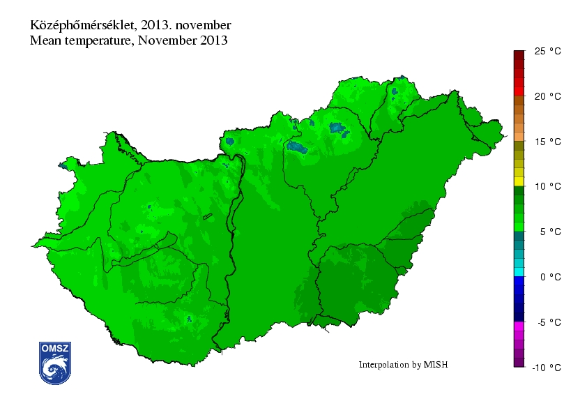 Hazánk nyugati és északi területein 6-7°C-os középhőmérséklet volt jellemző novemberben, a középső és északkeleti térségben 7-8°C-os, míg délkeleten volt a legenyhébb a hónap, itt 8-9°C közötti középhőmérséklet jelentkezett.
