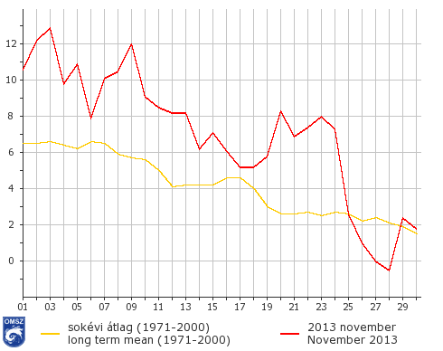 Napi középhőmérsékletek és a sokévi átlagok országos átlagban (°C)