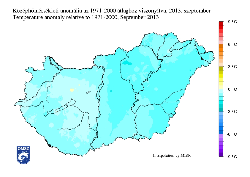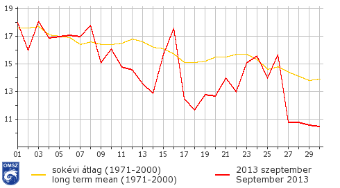 A szeptember átlag körüli napi középhőmérsékletekkel indult, majd 9-től a hónap végéig, 2 rövidebb időszaktól eltekintve, normál alatti értékek jelentkeztek. A legnagyobb negatív eltérések 14-én, 18-án, valamint 27-30-a között adódtak, ezeken a napokon 3-3,5°C-kal volt hidegebb az átlagosnál. Országos átlagban a legnagyobb középhőmérsékletet 3-án jegyeztük, a hónap legmagasabb hőmérsékletét (29,6°C-ot) azonban 8-án, Baja Csávoly állomáson regisztráltuk. A leghidegebb nap 30-a volt, a legalacsonyabb hőmérsékletet (-2°C-ot) pedig 29-én, Nyírlugos állomáson mértük.