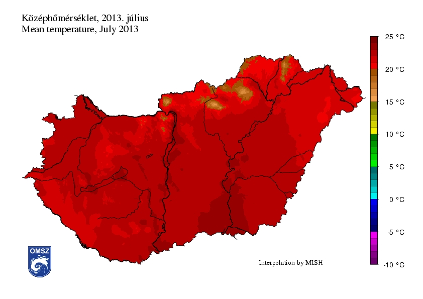 Hazánk legnagyobb részén a július havi középhőmérséklet 21-23°C között alakult. Az ország legmelegebb területei délen, főként DK-en figyelhetők meg, de a Duna vonalában, Budapesten és vonzáskörzetében, valamint a Balatonnál is több helyen jegyeztünk 23-24°C közötti havi átlaghőmérsékletet. A legmagasabb havi átlagértéket Szegedről jelentették (24,4°C), a legenyhébb júliust pedig Kékestetőn regisztráltuk (16,9°C).