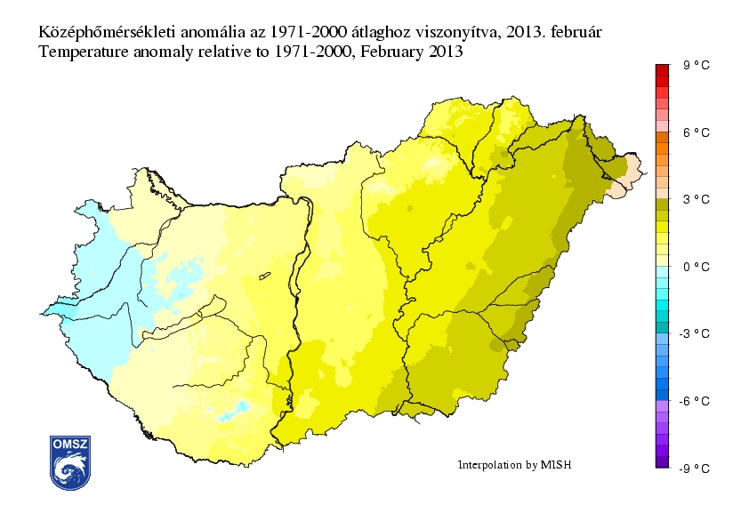 A középhőmérsékleti anomália térképén NY-K irányú növekedést láthatunk: míg a nyugati országrészben az 1971-2000 közötti időszak átlagánál valamelyest (0-1°C-kal) hűvösebb volt jellemző, keleten 2-3°C-kal melegebb volt a megszokottnál. Pátyod környékén még a +3°C-ot is átlépte a hőmérséklet-különbség. Országos átlagban az idei február középhőmérséklete 1,8°C, mely 1 fokkal magasabb az 1971-2000-es normálnál.