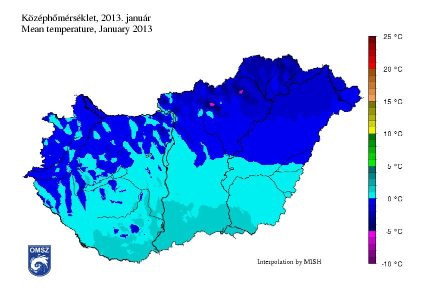 A középhőmérséklet 2013 januárjában É-D irányú növekedést mutatott: az ország északi részein 0 és -2°C között alakult a hőmérséklet havi átlagban, a középső területeken 0 és 1°C közötti, délen pedig 1-2°C közötti ez az érték. Alacsonyabb értékeket a magasabban fekvő területeken mértünk (Északi-középhegység, Mecsek). A legalacsonyabb januári középhőmérsékletet Kékestető állomásunkon jegyeztük -5°C körüli értékkel.