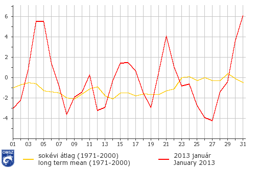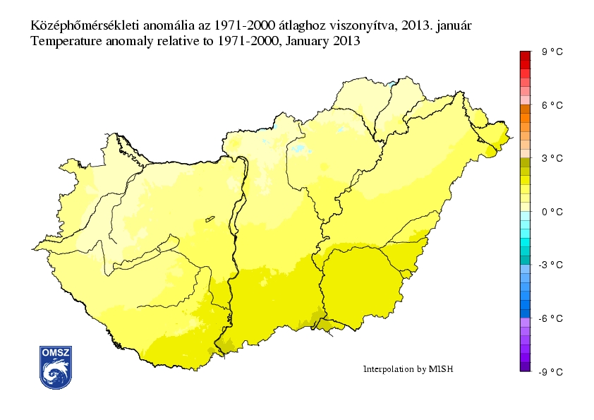 Január az ország legnagyobb területén melegebb volt a megszokottnál, mindössze északon találunk néhány települést, melyek havi középhőmérséklete – jellemzően 0,3°C-kal – elmarad a sokéves átlagtól. A havi középhőmérsékletek eloszlásához hasonlóan az anomália térképen is É (ÉNY) – D (DK) növekedést láthatunk. A legnagyobb pozitív eltérést Szeged és Mohács környékén jegyeztük (+2-2,5°C). Országos átlagban 0,8°C-kal volt melegebb az idei január a megszokottnál.