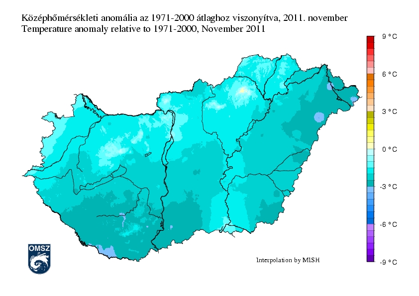 Hazánkban szinte mindenütt alacsonyabb volt az átlaghőmérséklet a sokévi átlagnál, látványosabb kivételt csak a Bükk képviselt, de az értékek itt is +0,5 °C alatt maradtak. Az anomália javarészt -1 és -3 °C között változott, de kis területen az északkeleti és a délnyugati országrészben abszolút értékben ennél nagyobb negatív különbségek is előfordultak.