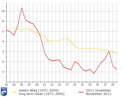 Napi középhőmérsékletek és a sokévi átlagok országos átlagban (°C)