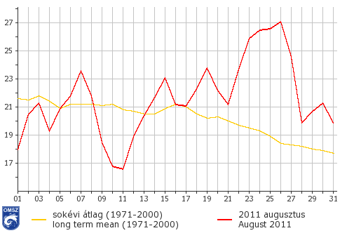 Míg a hónap első felében országos átlagban a szokásosnál hidegebb, a második felében a szokásosnál melegebb napokat tapasztalhattunk. A leghűvösebb nap a 11-e volt, 17 °C alatti középhőmérséklettel. Ekkor az erre a napra jellemző minimumhőmérsékleti rekord is megdőlt, Nagykanizsán csupán 5,1 °C-ot mértünk a hajnali órákban. A legnagyobb kánikula augusztus 26-án volt, az átlaghőmérséklet ekkor a 27 °C-ot is meghaladta, a legmagasabb hőmérséklet országszerte 35 °C körüli volt. A kánikula időszakában kétszer is megdőlt a maximumhőmérséklet napi rekordja, 24-én Bugacon 39,1 °C-ot, 25-én Baja Csávoly állomásunkon 39,2 °C-ot is mutatott a hőmérő.