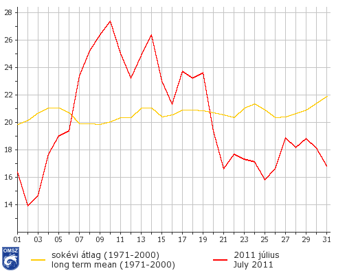 A hónap elején az átlagosnál hűvösebb időjárás volt jellemző, majd július 2-ától 10-éig mintegy 14 °C-ot emelkedett az országos átlagban vett napi középhőmérséklet, elérve a havi csúcshőmérsékletet. A felmelegedés időszakában két alkalommal is megdőlt a napi melegrekord, 9-én Pécsett 37,9 °C-ot, 10-én Túrkevén 39,1 °C-ot mértünk. Utóbbi egyben a hónap során regisztrált legmagasabb hőmérséklet is volt. Egészen 19-éig melegebb volt a szokásosnál, majd ezután egy intenzívebb lehűlést követően a hőmérséklet az átlag alá süllyedt és a hónap végéig alatta is maradt.