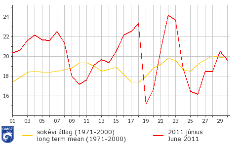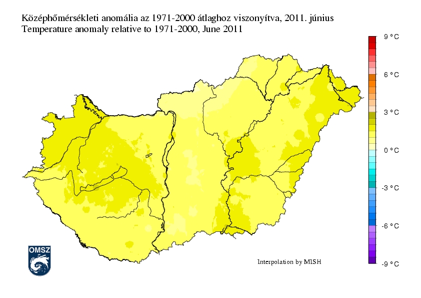 Az ország egész területén melegebbnek bizonyult az idei június, az értékek nagy többsége +0,5 és +2 °C közötti volt. Az anomália az ország középső részétől a határok felé növekvő elrendeződést mutatott.