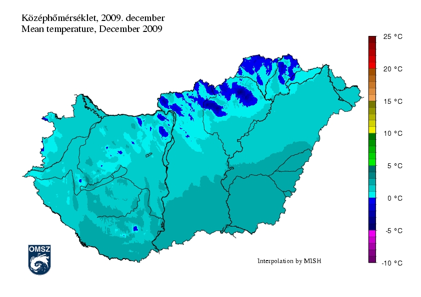 Az átlaghőmérsékleti térképen szépen kirajzolódnak középhegységeink, a legalacsonyabb értékek (-5 - -4 °C) a Mátrában és a Bükkben jelentkeztek. Az ország területét összességében északnyugatról délkelet felé növekvő értékek jellemezték: míg a Kisalföldön 1-2 °C közötti középértékek adódtak, az Alföldön 2-3 °C volt a havi középhőmérséklet.
