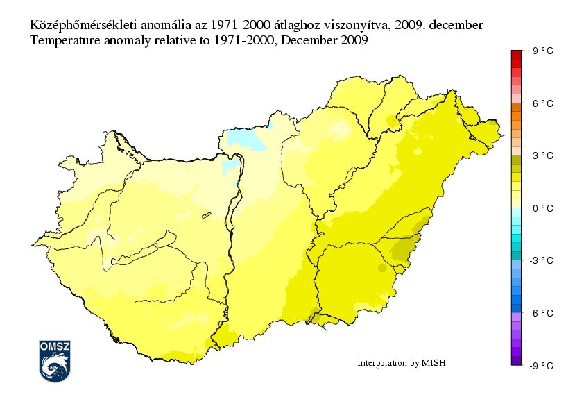Az ország nagy részét pozitív hőmérsékleti anomália jellemezte, kivételt ez alól csupán a Börzsöny és Cserhát jelentett, ahol mintegy 0,5 °C-kal volt hidegebb a vártnál. Ez azonban nem vált ki élesen az északnyugat-délkeleti övezetességet mutató képből. Az ország északnyugati felében jellemző 0-1 °C-os értékeket az Alföldön 1-2 °C-os, helyenként a 2 °C-ot meghaladó eltérés váltotta fel.