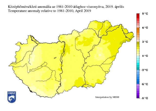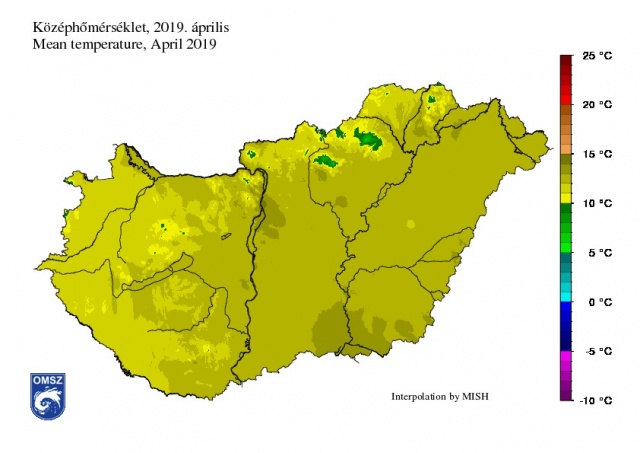Országos átlagban az április középhőmérséklete 12,32°C-nak adódott, ami 1,3°C-kal magasabb az 1981–2010-es átlagnál. Ezzel 1901 óta az idei volt a 22. legmelegebb április. Hazánk egész területén a szokásosnál melegebb hónapot tudhatunk magunk mögött. A hőmérsékleti anomália kelet felé haladva növekedett. A főváros térségében, a Dél-Alföldön, illetve az északkeleti országrészben az eltérés meghaladta a 1,5°C-ot, helyenként a 2°C-ot is. Az ország nyugat, délnyugati területein az átlaghoz közelebb alakult a hőmérséklet, azokon a tájakon 0 és 1°C közötti pozitív eltérés volt detektálható.