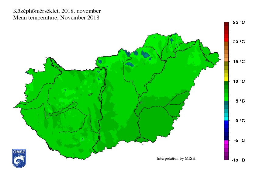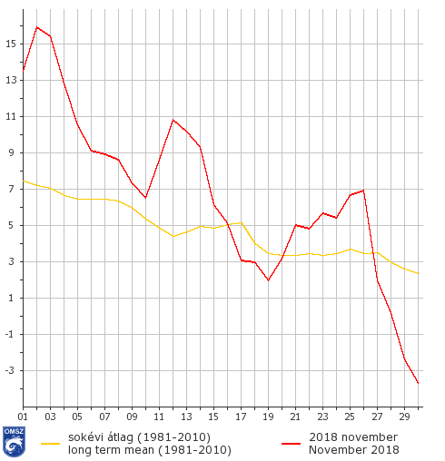 November első felében átlag feletti hőmérsékleti értékeket jegyeztünk. A hónap közepén egy északkelet felől érkező gyengülő hidegfront és egy délről érkező mediterrán ciklon együttes hatásának köszönhetően átlag alatti értékek jelentkeztek, majd november 20-tól melegebb léghullámok árasztották el a Kárpát-medence térségét az átlagosnál több fokkal magasabb csúcshőmérsékleti értékeket eredményezve. November 27-én egy mediterrán ciklon vonult végig az országon, és ennek köszönhetően fagypont alatti értékeket mértünk.