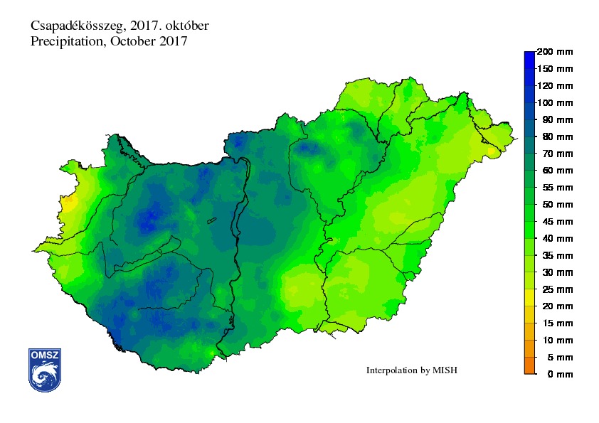Az októberi csapadékmennyiség leginkább a Dunántúli területekre koncentrálódott, 120-150 mm közötti értékekkel. A legnagyobb havi összeget Bakonybél Somhegypuszta állomásunkon mértük, 134,6 mm-rel. Az ország keleti részén, a Tiszántúlon valamint a Kőszegi-hegység területén jelentkezett a legkisebb csapadékösszeg. Előfordultak olyan területek, ahol 20 mm alatt maradt a havi csapadékösszeg.