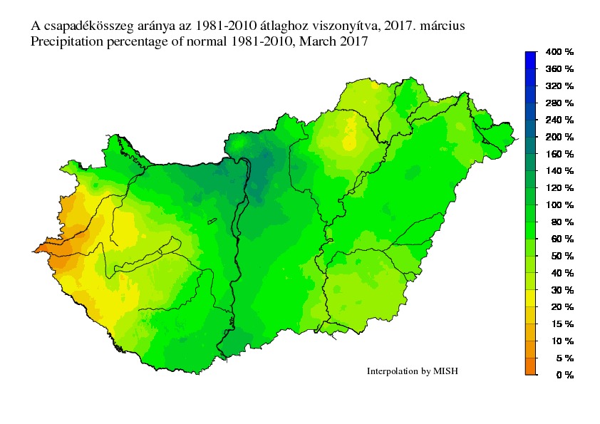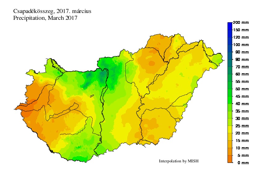 A havi csapadékmennyiség leginkább a középső országrészre koncentrálódott, 40-50 mm feletti értékeket eredményezve. Gerecse-tetőn regisztráltuk a legnagyobb havi összeget, 64 mm-rel. Az ország északkeleti és nyugati részein jelentkezett a legkisebb csapadékösszeg, az Őrség egyes részein 5 mm alatti csapadékösszegeket mértünk.