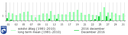 Decemberben a gyakran borult, ködös időjárás miatt ködszitálás, zúzmarás köd hozott csekély csapadékot. Pár napon frontátvonulásból származó esőt, ónos esőt, kisebb havazást, hózáport rögzítettek az automaták és megfigyelőink. Az átlagos napi csapadékösszeg egész hónapban nem érte el a sokévi átlagot. A napi csapadékösszeg egész hónapban jóval 1 mm alatt maradt. Országos átlagban a legnagyobb napi csapadékmennyiséget december 25-én és 27-én mértük.