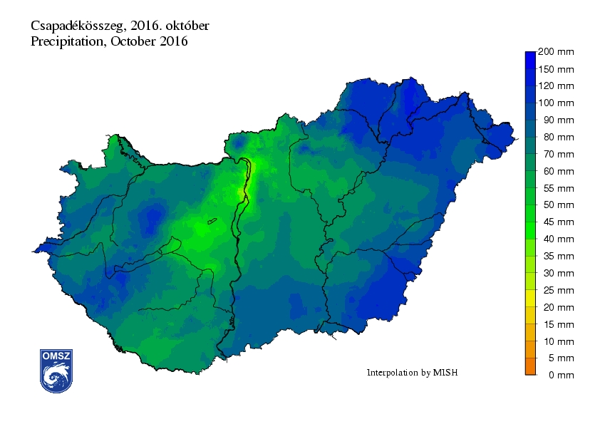 A havi csapadékmennyiség leginkább a keleti országrészbe koncentrálódott, 100 mm feletti értékeket eredményezve. A legnagyobb havi összeget a Borsod-Abaúj-Zemplén megyei Tolcsva állomáson regisztráltunk, 133 mm-rel. Az ország középső részén és a Mezőföld területén jelentkezett a legkisebb csapadékösszeg, és Budapest belterületen mértük a legalacsonyabb értéket, 29,8 mm-rel.