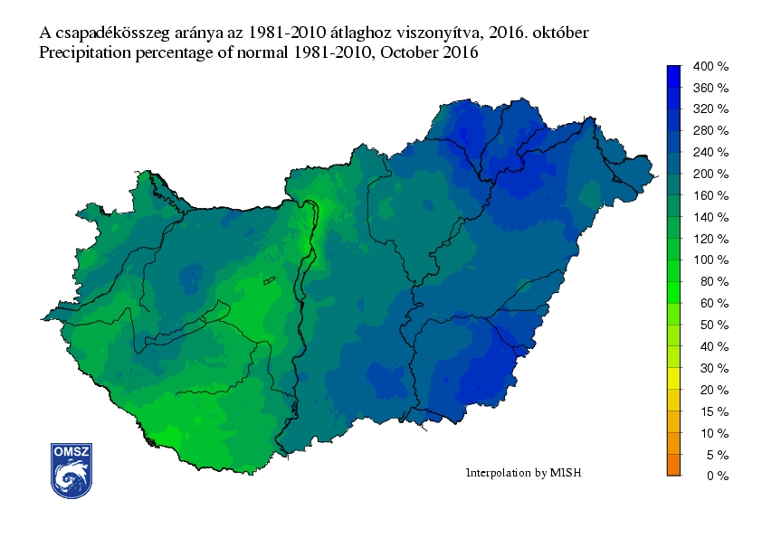 Az 1981-2010-es sokévi átlaghoz viszonyítva, több mint 80%-kal hullott több csapadék októberben, azonban térben nem egyenletesen oszlott el. A legnagyobb csapadéktöbblet (a sokévi átlag 280-300%-a) az északkeleti és a délkeleti területeken, a legkisebb pedig Budapest környékén és a Dráva-sík egyes részein (80%) jelentkezett.