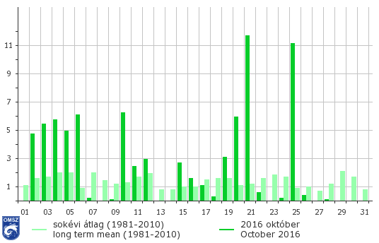 Az október meglehetősen csapadékosan indult. Több napon keresztül 4 mm felett alakultak az országos átlagok, továbbá 5 napon jelentkezett 5 mm, 3 napon 10 mm-t meghaladó csapadékmennyiség és előfordult 20 mm-nél nagyobb összeg is. A legtöbb csapadékot Miskolc Diósgyőr állomáson jegyeztük, 47,9 mm-rel. A csapadékos időszakot csupán az október végi, szárazabb időszak törte meg.