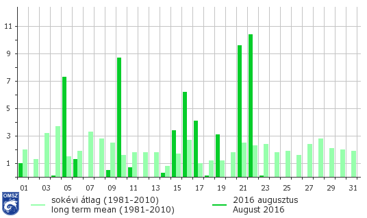 Összességében az augusztus lényegesen szárazabb volt, mint az előző nyári hónapok. Ennek ellenére országszerte voltak olyan felhőszakadások, heves zivatarok, amelyek fennakadásokat és károkat okoztak. A legtöbb csapadék országos átlagban augusztus 21-22-én hullott, de kiemelkedő mennyiségű csapadék érkezett augusztus 5, 10 és 15-17 között is. Országos átlagban 7 csapadékos nap (> 0,1 mm) jelentkezett, mely 1 nappal marad el a sokéves átlagtól, azonban sok helyről jelentettek hirtelen nagy mennyiségű (> 30 mm) esőt, és számos meteorológiai állomáson volt 24 óra alatt 50 mm feletti csapadékösszeg. A zivataros napok száma a sokéves átlaggal megegyezően 3 nap volt, a legtöbbet a Heves megyei Atkár településen rögzítettünk (9 nap). A nemzeti ünnepet követően a hónap vége meleg időjárás mellett csapadékmentesen telt.