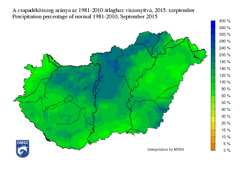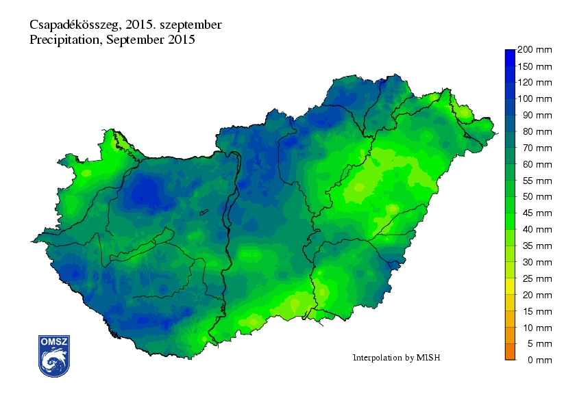 Szeptemberben, országos átlagban 65,7 mm csapadék hullott, ami több mint 10 mm-rel meghaladja a sokéves átlagot (54,7 mm). A csapadék területi eloszlása nagyon változatos képet mutat. Az Északi-középhegységben, a Bakonyban, a Dunántúli-dombság területén és a délnyugati határszélen hullott nagyobb mennyiségű csapadék, míg a Kisalföld északnyugati, az Alföld déli és a Tiszántúl északi részén mértük a legkisebb havi összegeket. A legnagyobb havi csapadékösszeget Bakonykoppányban (128 mm), míg a legkevesebbet Sápon (26 mm) regisztráltuk.