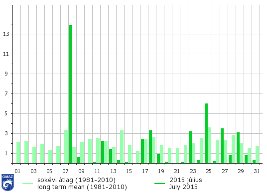 A napi csapadékösszegek országos átlagait tekintve egy kiugró értéket láthatunk: a július 8-án lehullott mennyiség a legmagasabb a hónapban, országos átlagban (12,5 mm). 5 mm feletti csapadékösszeget ezen kívül mindössze 25-én jegyeztünk. A hónap végén Püspökladány mellett tornádót is megfigyeltek olvasóink.