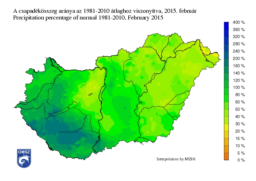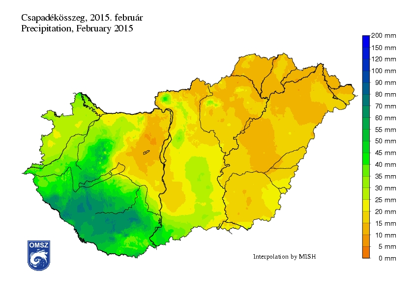 A legtöbb csapadék februárban az ország DNy-i részén hullott, ezeken a területeken 50-80 mm havi összegeket jegyeztünk. A Nyugat-Dunántúlon és a Közép-Dunántúl egy részén 20-45 mm volt jellemző, azonban keletebbre már csak 10 és 25 mm közötti mennyiségek láthatók.