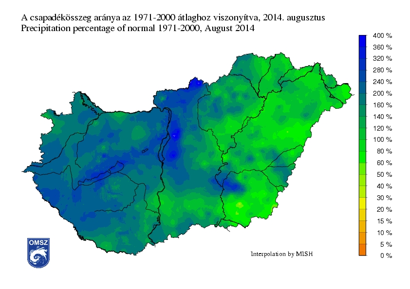 A sokéves átlaghoz képest Budapest környékén és a nyugati országrészben látható a legnagyobb pozitív anomália: Pest-megye több településén a megszokott mennyiség több mint három és félszerese hullott le, nyugaton pedig jellemzően több mint kétszerese. Keleten 60-160% közötti mennyiségek láthatók.