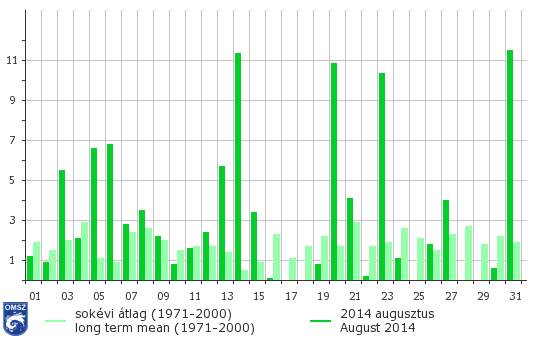 Országos átlagban augusztus utolsó napja bizonyult a legcsapadékosabbnak. A megszokottnál csapadékosabb volt még a 3-a és 9-e közötti időszak is. A hónap során mindössze öt napon nem hullott mérhető mennyiségű csapadék országos átlagban.