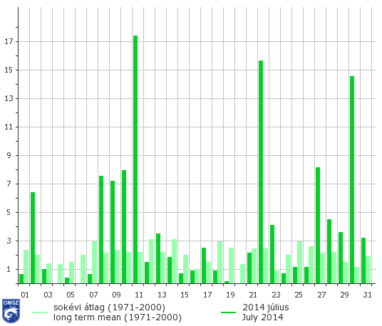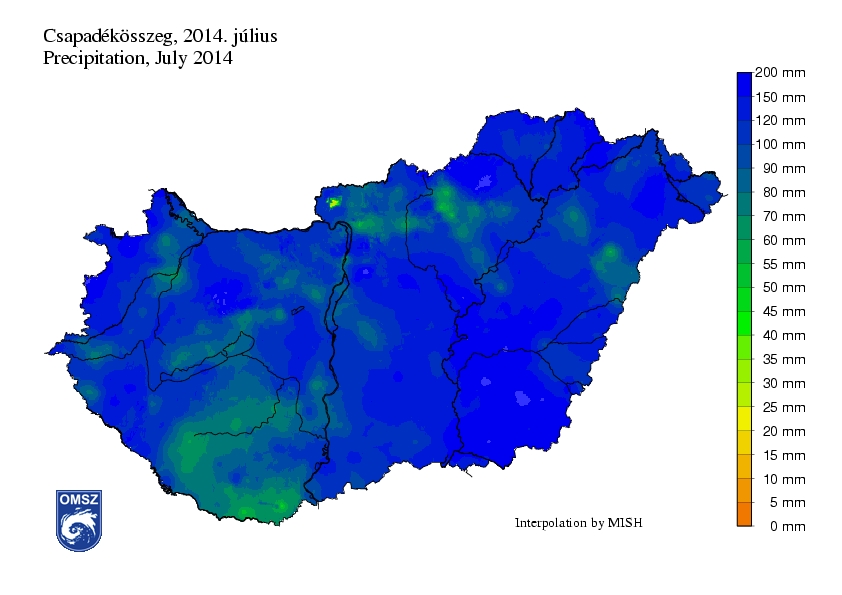 Hazánk legnagyobb részén 100 és 200 mm között alakult a havi csapadékösszeg. Jellemzően a Dunától keletre hullottak a legnagyobb mennyiségek. Az országos átlag 120 mm, mely a megszokott mennyiség mintegy 183%-a, 1901 óta pedig a 6. legmagasabb júliusi havi átlag. A legmagasabb havi összeget Budapest Rákoscsabán jegyeztük (269,2 mm), a legkevesebb csapadékot Nagy-Hideg-hegy állomásunkról jelentették (18,2 mm).
