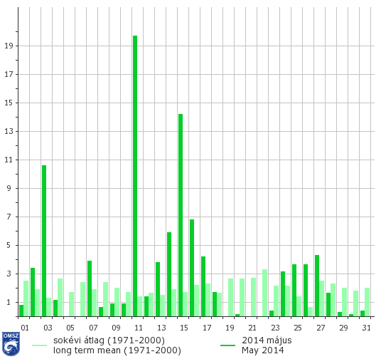 Május hónap folyamán 25 nap hullott csapadék. A 11-i csapadék maximumot egy hullámzó frontrendszer okozta. Ezen a napon Csepregen hullott a legtöbb csapadék (59,7 mm).