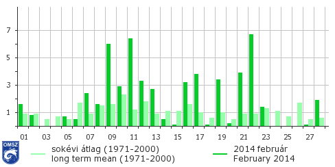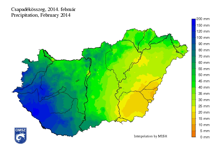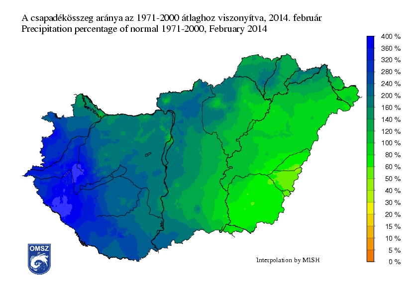 Országos átlagban a megszokott csapadékmennyiség majdnem 180%-a hullott le februárban, mely eredmény leginkább a nyugati területek bő csapadéktöbbletének köszönhetően alakult ki. A Ny-i határszélen több helyen az adott területre vonatkozó normál közel négyszeresét jegyeztük, de a teljes Ny-i országrészre 140%-ot meghaladó anomália volt jellemző. K-en 30% és 120% között változtak az értékek.