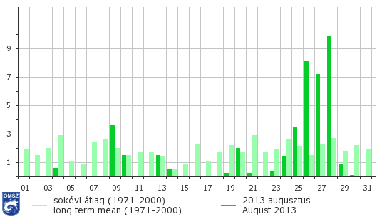 Országos átlagban a legcsapadékosabb napok augusztusban a 25-e és 28-a közötti intervallumra estek. Többfelé előfordult, hogy a hónap összes csapadéka ebben az időszakban hullott le, így például a Törökszentmiklóson 26-a és 28-a között jegyzett több mint 73 mm is. A hónap legnagyobb napi csapadékösszegét Zircről jelentették, ahol egyetlen nap leforgása alatt 78,5 mm eső esett (augusztus 27-én). A hónap végi csapadékos perióduson kívül még 9-ét említhetjük, ugyanakkor ezt az 5 napot leszámítva a hónap többi napján egyáltalán nem, vagy csak nagyon kevés esőt jegyeztünk hazánkban országos átlagban.